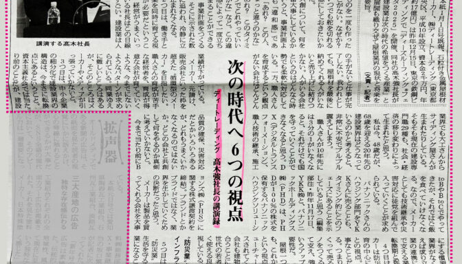 日本屋根経済新聞にて、昨年末に開催されました屋根材販売会社ディートレーディング主催の「ディーズルーフィングフェスタ2025」での、当協会代表の高木理事の講演要旨が掲載されました。