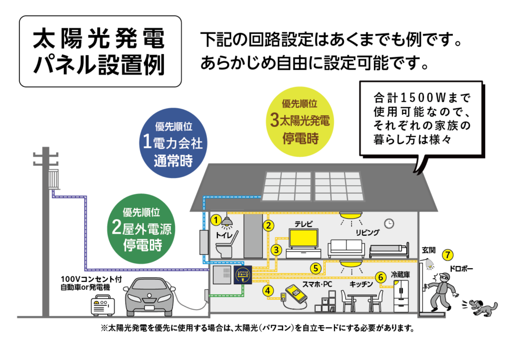 最大5回路までが使用可能になります。停電時必要な特定回路へあらかじめ設定しておけば、工事は大掛かりな電気配線工事も無く、電力会社の復旧まで安心です。