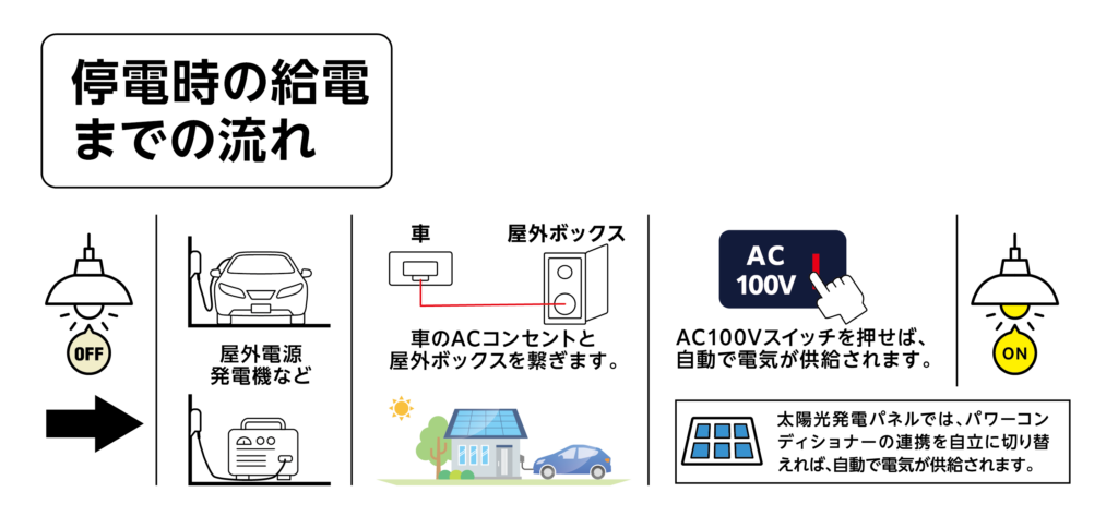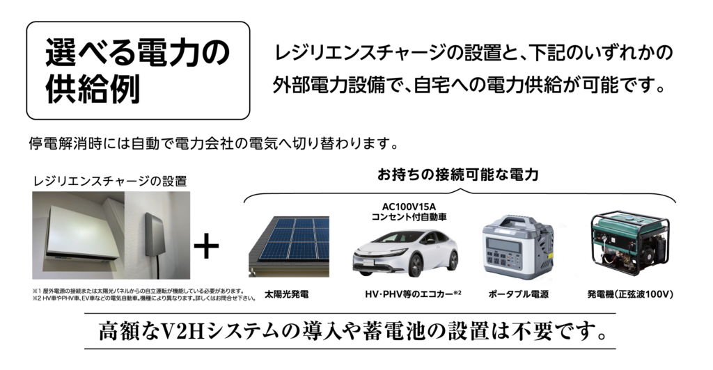 レジリエンスチャージの設置と「太陽光発電」「HV・PHV等のエコカー」「ポータブル電源」「発電機(正弦波100V)」のいずれかの外部電力設備で、自宅への電力供給が可能です。